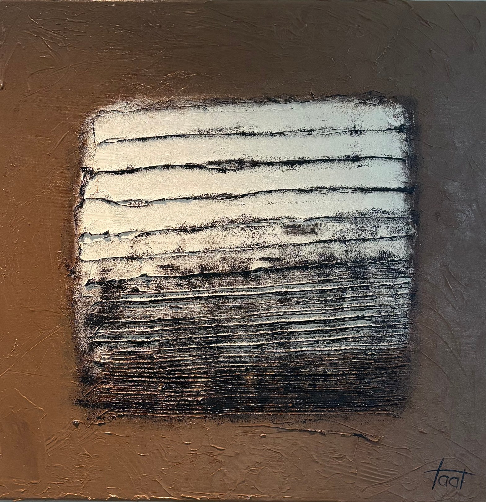 Het werk voelt gesloten én open. Kleur en textuur wisselen tussen weerstand en zachtheid. Wat op het eerste gezicht verstild lijkt, komt in beweging.