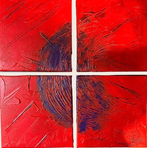 Waves of Bliss is een abstracte verkenning van geluk als beweging. Rood staat voor pure levenskracht, intens en ongeremd. Blauwe golven, als momenten van helderheid – stromingen van rust in een kolkende zee van emotie. Het werk vangt de essentie van geluk niet als stilstand, maar als een voortdurende stroom: krachtig, kwetsbaar en steeds in verandering.