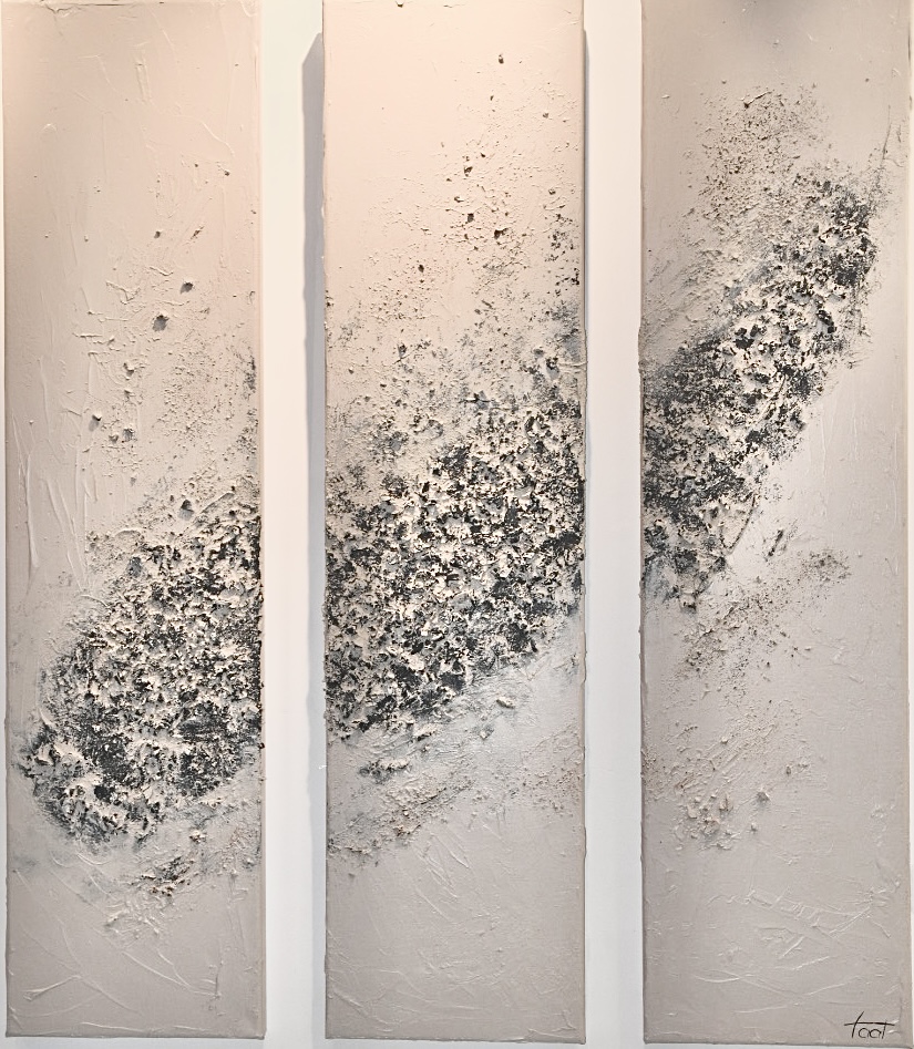 Een stille transformatie voltrekt zich onder het oppervlak. Wat eerst massief en ondoordringbaar lijkt, begint van binnenuit los te laten, terwijl subtiele sporen van licht zich een weg banen door de zwaarte. Een herinnering dat zelfs in stilstand iets verschuift… en dat wat zwaar voelt niet blijvend is. Taat #20100 x 100 cm€ 995,-